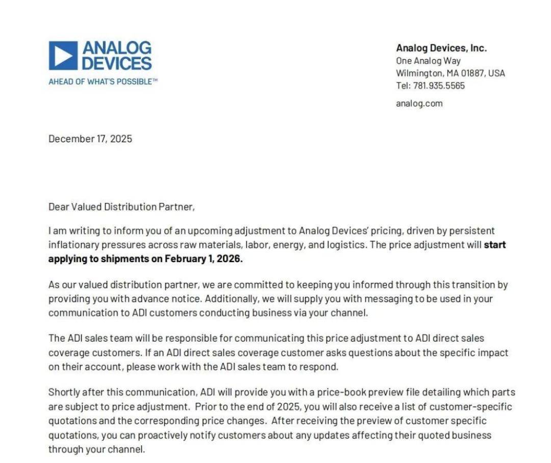 根据ADI的涨价通知,新的价格体系将适用于所有未发货的订单。对于已经发货的订单,则仍按原价执行。这一安排旨在减少对现有合同和客户关系的冲击,同时确保价格调整的平稳过渡。