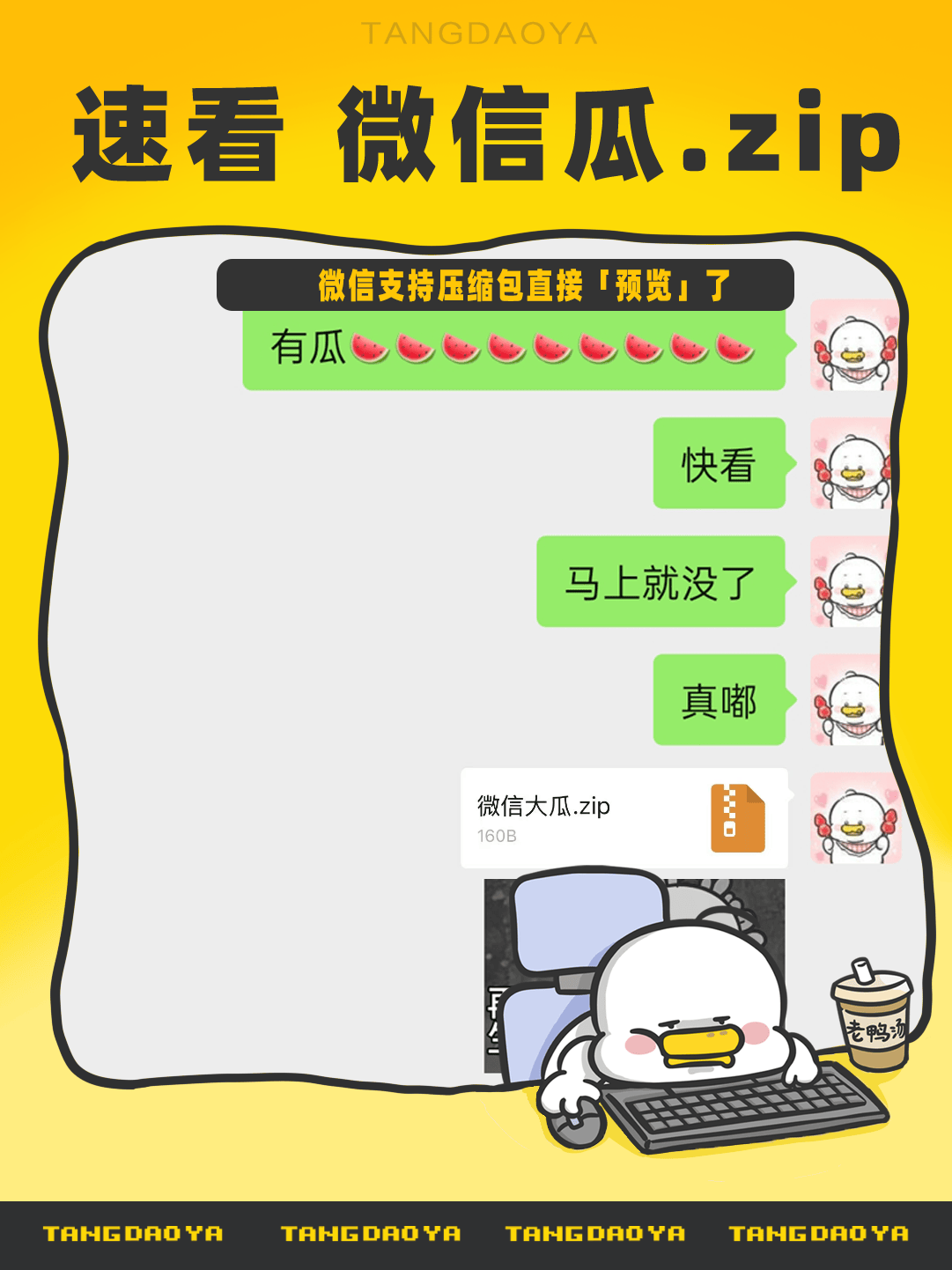 正文 速看!微信大瓜.zip 吃瓜先锋 V管理员 /04-02 /0 评论 /20 阅读 0402 此篇文章发布距今已超过7天,您需要注意文章的内容或图片是否可用! 点开压缩包选择「预览」,不需要下载、不需要额外解压,也能一眼看全压缩包内容。 预览压缩包时,点击右上角按钮就能切换视图,重要内容提前看! 除了直接转发压缩包邀请给微信好友,你也可以选择单个或多个压缩包里的文件,一键保存/转发/收藏。不下载全部,只摘取需要的文件!好好好,这个实用,不用借助三方工具,还能缓解手机储存焦虑! 这瓜大家满意吗? 图片资料来源:微信派